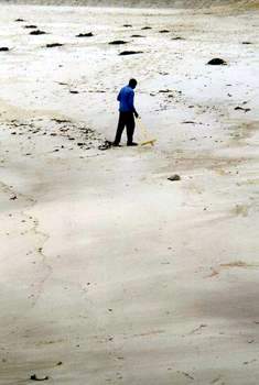 Seetang vom Strand fegen