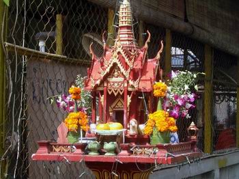 Die Menschen errichten vor ihren Häusern kleine Tempel, in denen die Geister wohnen sollen. Die sind recht anspruchslos: Ein Glas Wasser, ein paar Räucherstäbchen gegen die Mücken, ein bisschen Klebreis – mehr brauchen sie nicht. Dafür schützen sie die Häuser und ihre Bewohner vor Diebstahl und Krankheiten. Wenn sie dem Haus besonders viel Glück bringen, bekommen sie auch Ringelrosen und Parfüm, darüber freuen sich die kleinen Wesen besonders.